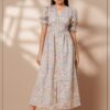 A graceful maxi dress in a soft lilac base, delicately scattered with miniature floral prints. Designed with a flattering V-neckline, puffed half sleeves, and a button-down front that adds timeless charm. The fitted empire waist flows into a breezy silhouette, while side pockets bring modern functionality. A perfect blend of romance and practicality for both day outings and evening elegance.