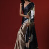 A captivating saree inspired by the tranquil evening sea, where midnight blues and blacks meet the golden sands, with birds soaring in the horizon. A harmonious blend of dark elegance and golden warmth.